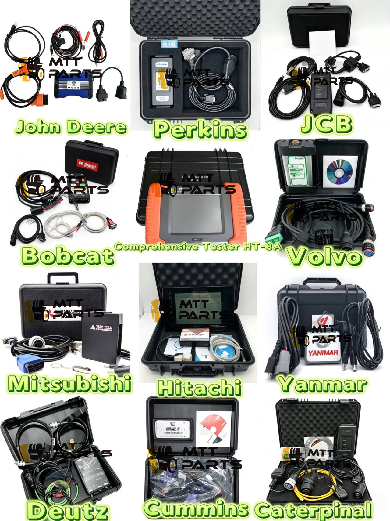 কী দাঁড়ায় তা হল তারা দেখতে কতটা ব্যবহারিক। অর্ধেক কাজ করতে পারে এমন কোন জেনেরিক সরঞ্জাম নেই; এগুলি হল ব্র্যান্ড-নির্দিষ্ট সেটআপ যা সঠিকভাবে সংযোগ করে এবং আপনাকে প্রকৃতপক্ষে প্রয়োজনীয় ডেটা দেয়। এমনকি মাঝখানে দেখানো একটি বিস্তৃত অল-ইন-ওয়ান টেস্টার (HT-8A) রয়েছে, এছাড়াও Yanmar বা Bobcat-এর মতো ভালো ডায়াগনস্টিক খুঁজে পাওয়া একটু কঠিন ব্র্যান্ডের বিকল্প।